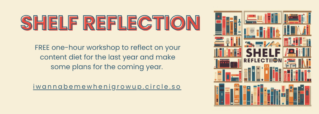 As noted above, I’d love your input on what you’d like to see more of in 2026 in the Circle Community. One of the things I’ve done for the last several years is do a little end of the year reading wrap up and set some reading intentions for next year. If you’d like to join me in this process, I’ve added two new “Shelf Reflection” events here in Circle. I hope you’ll join me to talk about what we read, watched, and listened to in 2025 and what we want more of in 2026. To learn more, click on the links below. I'm currently planning to offer two sessions. They are the same from my end, but given who shows up could result in very different conversation so come to one or both!